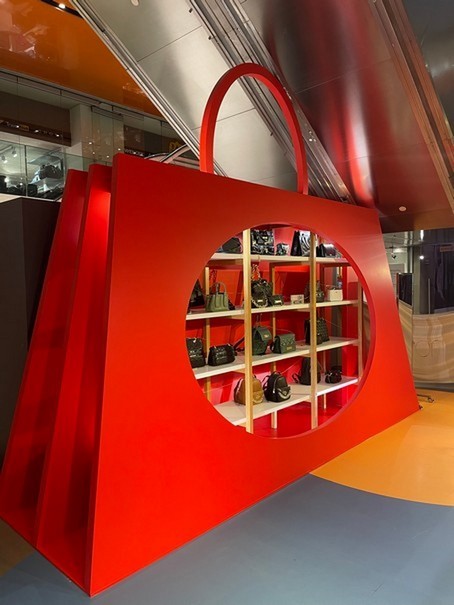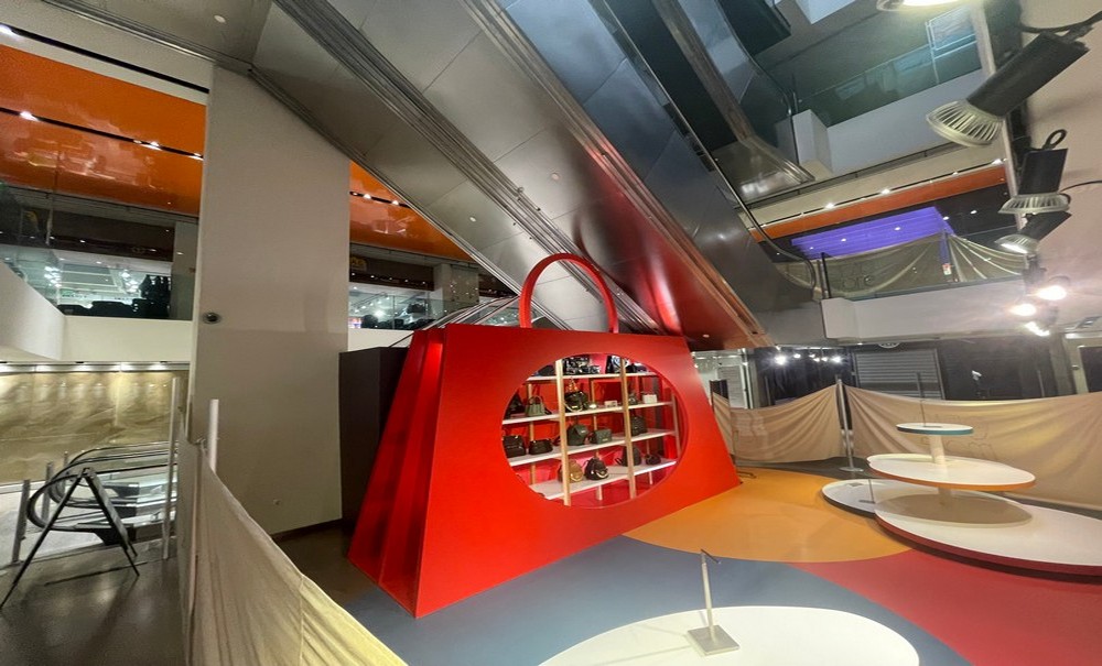 Ξύλινη κατασκευή σε σχήμα τσάντας για το ισόγειο του πολυκαταστήματος Notos επί των οδών Τσιμισκή 24 & Μητροπόλεως 31 στη Θεσσαλονίκη